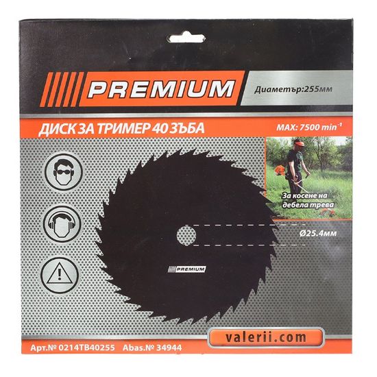 Диск за тример с 40 зъба на марката PREMIUM, предназначен за косене на дебелостеблена трева и плевели с жилави стъбла.Изработен е от високовъглеродна стомана.Външният му диаметър е 230 мм, а диаметърът на вътрешния отвор - 25.4 мм.Работи с максимално допустими обороти: 7500 об./мин.