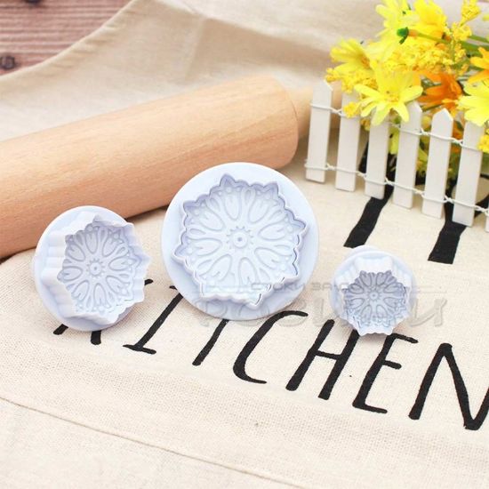 Комплект от три пластмасови форми за сладки с различна големина и с бутало за по-лесна употреба.Резците са с красива форма на маргаритки и дават възможност да развихрите въображението си при направата на украса за торти, сладкиши, кейкове и др.Подходящи са за използване с фондан или друг вид тесто.Формите са удобни за употреба и лесни за почистване.Размерите на цветята са: 5,5 см, 4,3 см, 3 см.