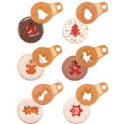 Комплектът съдържа две кръгли формички за бисквитки с прави и вълнообразни ръбове и шест мини формички с коледни мотиви (елхичка, камбанка, снежен човек, звездичка, комета, канелено човече) за изрязване на фигурки