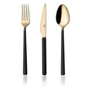 Комплект прибори от 18 части от серията Cubuk на турската марка HIRA с атрактивна визия, подходящ за шест души.Комплектът съдържа 6 лъжици, 6 вилици и 6 ножа, в цвят злато и черно и с покритие тип седефено.Приборите са изработени от неръждаема стомана тип 304 (с дебелина 3 мм при вилиците и лъжиците и 10 мм при ножовете).Отличават се с естетичен дизайн, модерен външен вид, здравина и дълъг експлоатационен срок.Имат отлична устойчивост на корозия, лесни са за миене и съхранение.Балансираното тегло и гладката повърхност осигуряват естетическо удоволствие при захващане и комфорт при държане на приборите.Комплектът е подходящ както за домашна употреба, така и за семейни събирания, сервиране на партита и др. Идеален е както за дома, така и за сватби или други празнични събития.Перфектен подарък за младо семейство или приятели.При спазване на препоръките за употреба приборите запазват своя блясък и стилен вид както в първия ден.Лъжиците и вилиците са с дължина 20.7 см, а ножовете са дълги 22 см.
