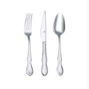 Комплект прибори от 24 части от серията Milano на турската марка HIRA с атрактивна визия, подходящ за шест души.Комплектът съдържа 6 лъжици, 6 вилици, 6 ножа и 6 десертни лъжички.Приборите са в сребрист цвят и с интересни извивки в долната част на дръжките.Изработени са от неръждаема стомана тип 304 (с дебелина 3 мм при вилиците и лъжиците, 10 мм при ножовете и 2.5 мм при десертните лъжички).0тличават се със здравина и дълъг експлоатационен срок.При спазване на препоръките за употреба приборите запазват своя блясък и стилен вид както в първия ден.Вилиците и лъжиците са с дължина 20.2 см, ножовете - 22 см, а десертните лъжички - 16.5 см.*Могат да се мият в съдомиялна машина, на деликатна програма.