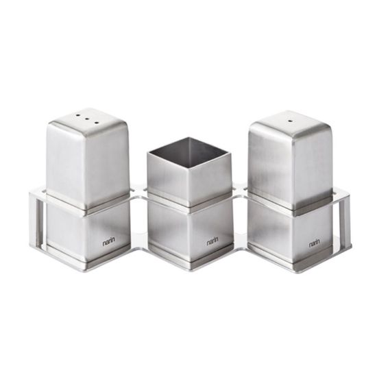 Комплектът съдържа: съд за сол- 1 бр., съд за пипер- 1 бр., съд за клечки за зъби-1 бр., поставка.