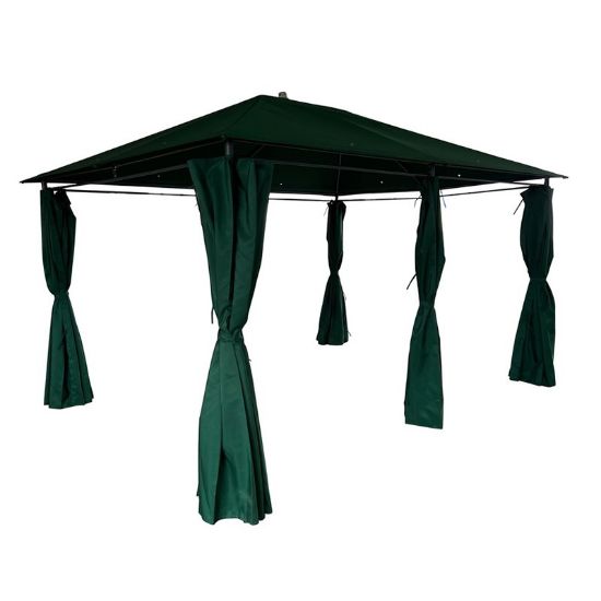 Конструкцията на павилиона е изработена от здрави метални профили, което гарантира стабилност и дълготрайност. Покривът е от висококачествен полиестер с полиетиленово покритие и плътност 180 гр/м², което го прави изключително издръжлив и устойчив на различни атмосферни условия. Покривът и шестте включени страници са в елегантен зелен цвят, който се вписва перфектно в естествената среда на всяка градина. Страниците могат да се монтират или премахват според вашите нужди, осигурявайки допълнителна защита от вятър, слънце или любопитни погледи.