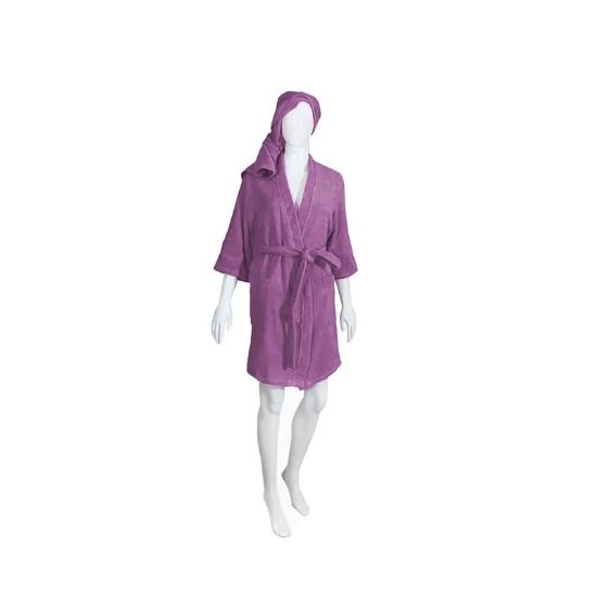 Елегантен дамски сет Релакс на марката BULGARIA TEX в цвят малина, състоящ се от втален, къс халат кимоно и хавлиена кърпа за глава с размери 60x110 см.Халатът и кърпата са изработени от 100% памук с плътност 320 гр/м².Отличават се с изключителна мекота и висока попиваемост.Чудесна придобивка за всяка жена, която е превърнала взимането на душ или вана в истинско изкуство.Халатът е размер M.