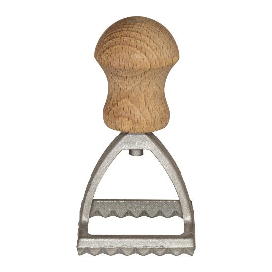 Инструмент за ръчно приготвяне на паста изработен от алуминий и дърво