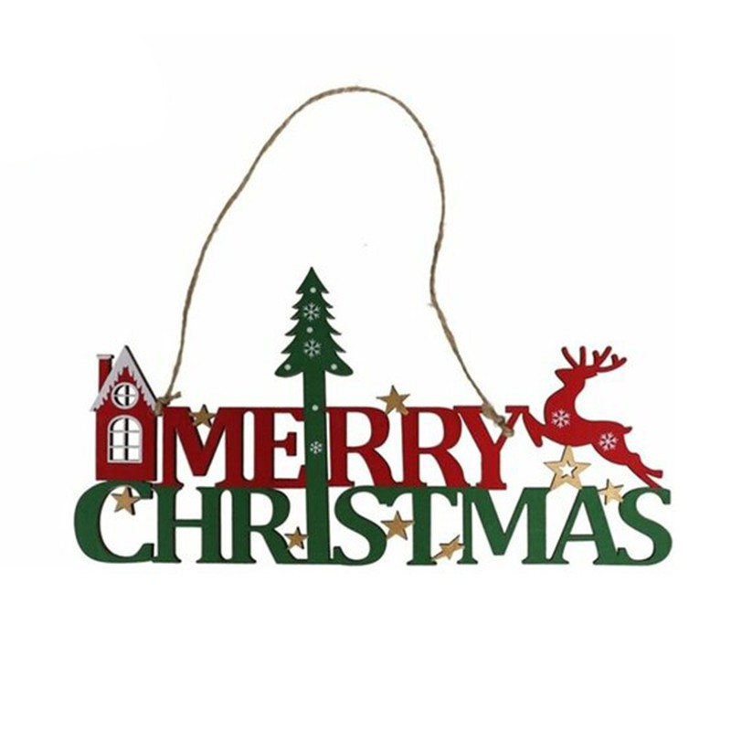 Ефектна, висяща, коледна украса с надпис Merry Christmas, къщичка, еленче, елхичка и звездички, изработена от дърво.Подходяща е за украса на врата или стена - във всекидневната или детската стая.Надписът Merry Christmas е в червено и зелено, в червен цвят са и къщичката и еленчето, а елхичката е зелена.Висящата украса е с размери 29.5x15.5 см.Създайте неповторима коледна атмосфера у дома и си подарете вълшебни празници.