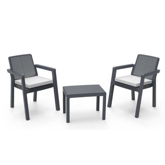 Градински комплект Prestige на VIOLET HOUSE в цвят антрацит, включващ маса и два стола с възглавници.Произведен от първокласна полипропиленова суровина, проектиран да бъде издръжлив и устойчив на вътрешни и външни условия.Възглавниците са с пълнеж от 100% полиестер. Може да се постави върху повърхности като трева, дърво, бетон, ламинат, гранит и плочки.Градинският комплект е подходящ е за използване на места на открито като кафене, ресторант, хотел, вила, градина, балкон, тераса и на закрито според предпочитанията.Размерите на масата са 58x39x41.5 см, а на столовете: 76x62x62 см.Използвайте вода и мек сапун, за да почистите мебелите.Марката VIOLET HOUSE е специализирана в дизайна на пластмасови изделия за дома.Основната цел на марката е да произвежда продукти, отговарящи на международните стандарти за качество.