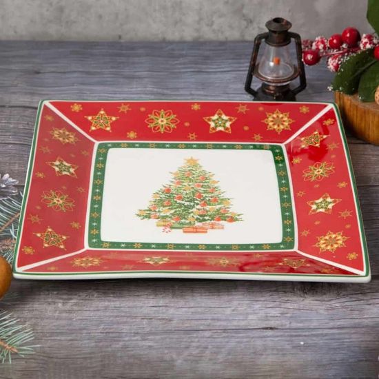Коледно плато с квадратно форма и с ефектна коледна декорация в свежи цветове.Платото е изработено от качествен порцелан, част от серия "Коледно дърво".Внесете коледен дух у дома и се погрижете за приказна празнична трапеза с това красиво коледно плато.Размерите му са 23x23x2 см (широчина/дължина/височина).Платото е произведено в Китай и е с тегло 800 грама.Предлага се в кутия.