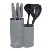 Комплект ножове и прибори за сервиране ZL 5129 ZILNER със стойка, съдържащ 8 части.Ножовете са с остриета от висококачествена неръждаема стомана и са лазерно заточени, което гарантира дълъг експлоатационен живот. Ножовете и приборите са с ергономична дръжка за по-добър комфорт и захват.Комплектът ZL 5129 ZILNER съдържа универсален нож с дължина 20 см, нож за хляб с дължина 20 см, нож на готвача с дължина 20 см, универсален нож с дължина 12.7 см, нож за белене с дължина 9 см, черпак, лъжица за сервиране, решетъчна лъжица и стойка.Ножове и прибори, които ще ви помогнат да реализирате кулинарните си възможности.