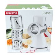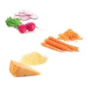 Комплекта включва четири различни барабана за смилане на тестени изделия на трохи, за стъргане и рязане на фино и едро на зеленчуци, за рязане на жулиени, за смилане на ядки, шоколад, сирене и други. С приставка за предпазване на пръстите. Бързо и стабилно захващане за повърхността чрез ръчка за вакуумно закрепяне. Изработена от специално закалена устойчива пластмаса и барабани от висок клас неръждаема стомана. Размери: Ø13xH25cm. Не е подходяща за почистване в съдомиялна машина.