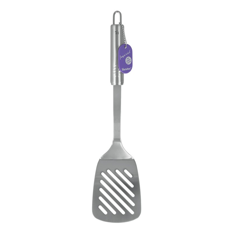 Оребрена шпатула от серията Imperial на марката METALTEX, изработена от неръждаема стомана и с хромирано покритие на металните части.Тя ще бъде чудесен помощник в кухнята при сервиране на различни ястия и десерти или при приготвяне на омлет, а благодарение на процепите бързо и лесно ще се отцежда излишната мазнина или друга течност.Приборът е снабден с отвор за закачане и с овална дръжка за по-голямо удобство при употреба.Шпатулата е с дължина 35 см.Може да се мие в съдомиялна машина.