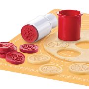 Предназначен за лесно приготвяне на декорирани домашни сладки от маслено и джинджифилово тесто. Комплектът включва печат, 6 сменяеми приставки с различни декори и кръгъл резец.